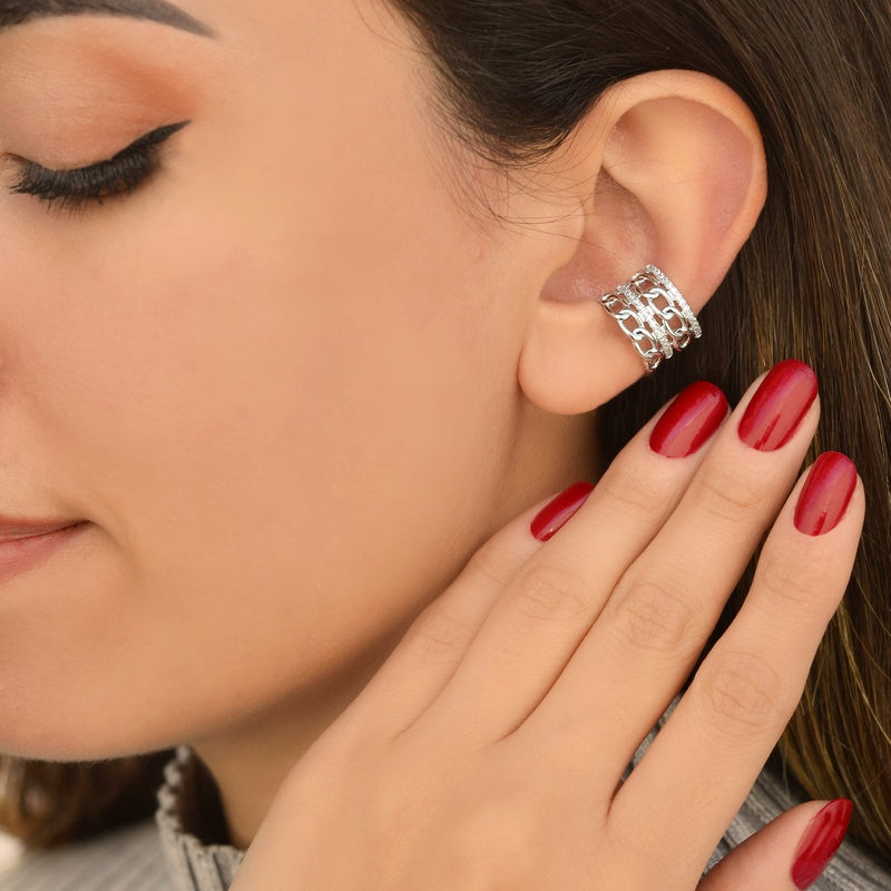 Add a unique touch to your look with our Chain Model Multiple Earcuff Cartilage Earrings. Made from original rhodium-plated material, also known as medical gold, and adorned with zircon stones, these earcuffs offer durability and style. No piercing required for wear.