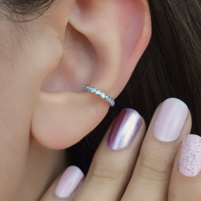 Add a touch of elegance to your look with our Compression Cartilage Earring Mini Thin Stone Earcuff. Made from original rhodium-plated xuping, also known as medical gold, and adorned with zircon stones, this earring combines durability and style. It is designed for comfort and does not require a pierced ear to wear.