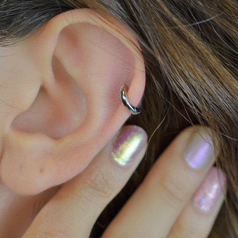 Elevate your piercing collection with our minimalist Flat Ring Tragus Piercing. Crafted from a blend of rhodium and silver, also known as medical gold, this piece combines simplicity with durability.
