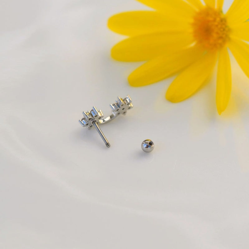 Piercing bar length is net 7 mm, bar thickness is 1 mm, flower diameter is 4 mm, the sum of the two flowers together with the interconnecting bar is 12 mm, flower stones are zircon.